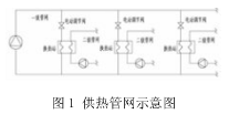 城市供熱管網(wǎng)系統(tǒng)是由多個串并聯(lián)管段組成的管路系統(tǒng),是城市集中供熱系統(tǒng)的重要組成部分。為滿足各熱用戶個性化供暖需求,實現(xiàn)系統(tǒng)的節(jié)能降耗,分戶計量控制供暖系統(tǒng)形式正在逐步推廣。由于采暖用戶的自主調(diào)節(jié),連接系統(tǒng)一、二級管網(wǎng)的換熱站應隨著用戶末端進行調(diào)節(jié)。首先是在二級管網(wǎng)側(cè)通過循環(huán)水泵的變頻,來保證二級管網(wǎng)某處的供、回水壓差不變,目的是穩(wěn)定因末端用戶用熱的改變而對管網(wǎng)水力工況的影響,然后,改變一級管網(wǎng)側(cè)的供熱參數(shù)來確保二級管網(wǎng)側(cè)的供水溫度、及供回水溫差的穩(wěn)定。在這一過程中,一級管網(wǎng)側(cè)實際上是按照二級管網(wǎng)側(cè)所需的供熱量在進行被動調(diào)節(jié)。然而,管網(wǎng)系統(tǒng)中各管路水力工況相互影響,系統(tǒng)中任何一個調(diào)節(jié)裝置的工作參數(shù)發(fā)生改變,必然會引起各熱用戶(換熱站)之間流量的重新分配。當各換熱站一級管網(wǎng)側(cè)均因二級管網(wǎng)側(cè)負荷的改變而各自進行被動調(diào)節(jié)時,由于各換熱站管路間水力工況相互影響,就必然會導致系統(tǒng)水力、熱力失調(diào),影響供熱效果。因此,為了提高供熱管網(wǎng)整體的運行調(diào)節(jié)與控制水平,減小水力、熱力失調(diào),保證供熱穩(wěn)定性,必須將換熱站一級管網(wǎng)各自的被動調(diào)節(jié)進行統(tǒng)一管理和控制。