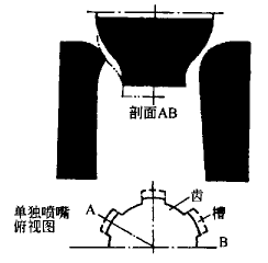 改進方法是在接觸環(huán)處噴嘴開始的地方加工出多條擴散狀凹槽,分別布置在噴嘴中,由相同尺寸的常規(guī)噴嘴分隔開,如圖3所示。這樣兩股汽流在交界面處發(fā)生強烈混合。由于粘性耗散的影響,如果激波發(fā)生,強度屬于中等。這種混合極其復雜,難以計算,但誘發(fā)的擾動消除了。