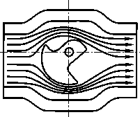 | (2)角行程的閥克服了直行程閥流路復雜和上下導向易堵卡的問題,介質流經角行程類 的閥,似乎是直接流進流出,最典型的就為“O”型球閥,就象直管道一樣,其防堵性能最好, (見圖三);其次就是全功能超輕型閥、蝶閥等,它們的節流形式見圖四、五。 | ||||||