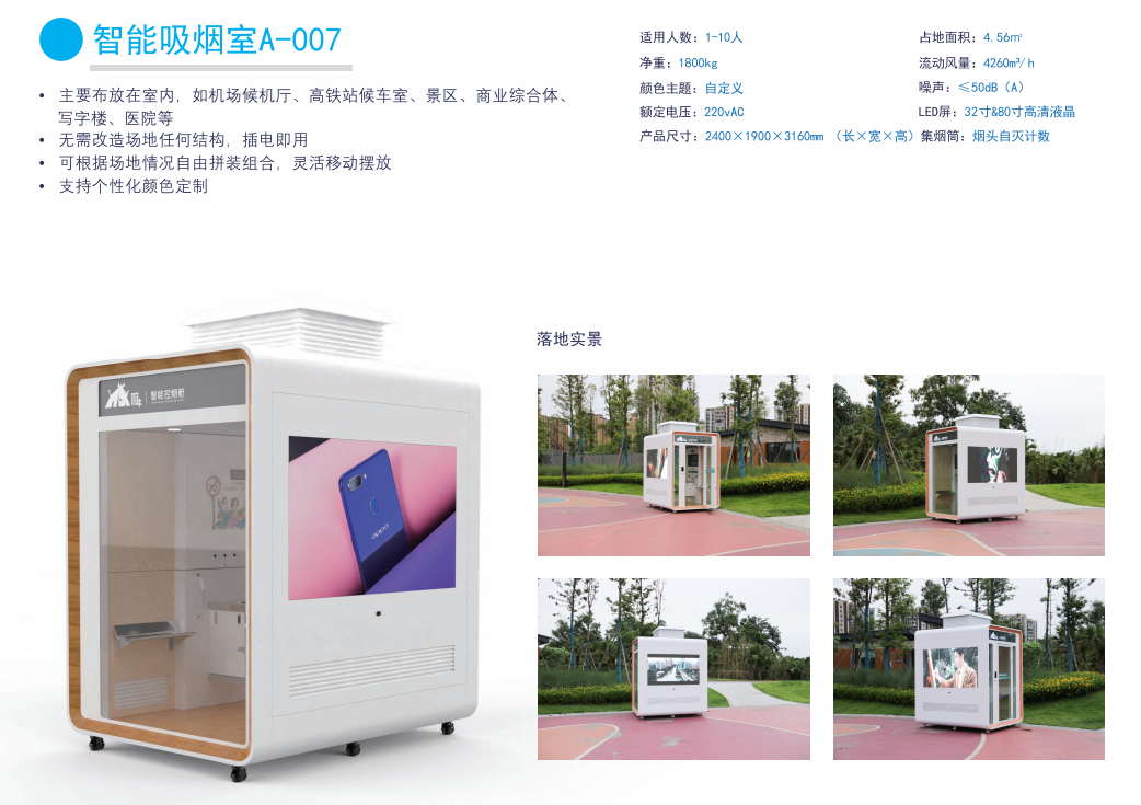 智能吸煙室A-007:主要布放在室內,如機場候機廳、高鐵站候車室、景區、商業綜合體、寫字樓、醫院等,無需改造場地任何結構,插電即用,可根據場地情況自由拼裝組合,靈活移動擺放支持個性化顏色定制。