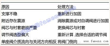解決措施:對于輕微的振動,可以通過增加閥門的剛度來消除,還可以選用剛度較高的彈簧,改用活塞式執行機構,管道和基座振蕩劇烈可以通過增加支撐來消除干擾;若閥門的振動頻率與系統頻率相同,則更換不同結構的閥門;工作在小開度情況下造成的振蕩,則是由于閥門流量值選擇過大造成的,這種情況必須重新選擇流量值與工藝相近(略大)的調節閥,或者采用分程調節方式,或者使用子母閥門以滿足調節閥在小開度情況下的工作。引起振蕩的原因及處理方法見表2。