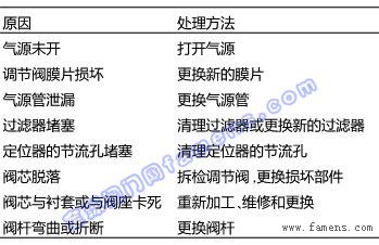 在日常生產操作中,調節閥不動作也是比較常見的故障。造成調節閥不動作原因和相應的處理方法見表1。