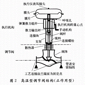 a)高溫(蒸汽介質)環境中,大多會出現填料泄漏故障,內件易損壞(閥芯閥座磨損失配、閥芯脫落),內部泄漏量大,不易控制,調節品質差,與工藝連接的法蘭端面很容易泄露等故障。圖1,圖2分別為普通調節閥和高溫型調節閥結構。從圖中可以看出,由于加了一截散熱器的距離,使用溫度越高散熱器就越長,因此,高溫型調節閥執行機構重心點距安裝軸線的距離,比普通型調節閥要長的多,非垂直安裝調節閥產生的力矩也要大得多。如:動力C鍋爐裝置的幾臺減溫減壓調節閥,合成氨裝置的調節閥等。