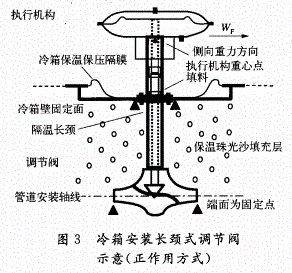 b)低溫(小于-100℃)深冷使用環境中,出現較多的也是填料泄漏故障。此類調節閥有較長的隔熱絕冷長頸,所處的環境溫差大,大多安裝使用在空分、液氮洗單元裝置上,它們基本上都有兩個支撐點,如圖3所示。管道和冷箱箱壁都是固定點,一端固定在管道、設備上,另一個就固定在保溫冷箱的邊壁上,閥體和長頸部分基本是固定死的,只有執行機構是側懸在冷箱壁之外的,如果執行機構太重并發生形變,受力點就在填料處,則填料處最易受力單邊磨損。空分、液氮洗(深冷)單元除箱頂安裝的調節閥以外,基本上都屬側裝和水平安裝。如:合成氨液氮洗裝置的調節閥,空分裝置的調節閥。
